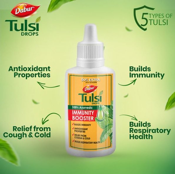 Dabur Tulsi Drop contains extracts of 5 types of tulsi leaves. Tulsi has antioxidant and antimicrobial properties. According to Ayurveda, tulsi supports digestive and skin health.